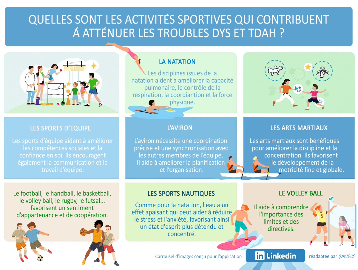 Les activités sportives peuvent offrir de nombreux bénéfices pour les enfants atteints de troubles "dys". Particulièrement utiles pour les enfants dyspraxiques, elles améliorent la motricité et la coordination, l'estime de soi et aident à réduire le stress et l'anxiété. Les sports d'équipe, la natation et les arts martiaux sont souvent recommandés. Pour autant, il faut être vigilant aux attendus de performance sportive.