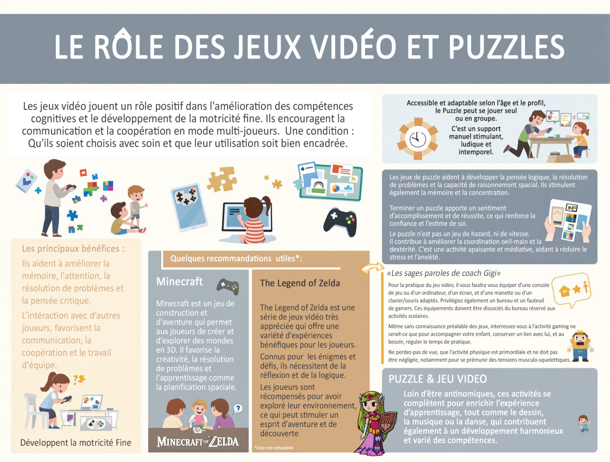 Les jeux vidéo peuvent également jouer un rôle positif dans l'amélioration des compétences cognitives et le développement de la motricité fine. Ils encouragent la communication et la coopération en mode multi-joueurs. Des jeux comme "Portal", "Minecraft", et "The Legend of Zelda" sont généralement recommandés pour leurs bénéfices cognitifs et créatifs. Il est crucial de réguler le temps passé devant les écrans sans pour autant véhiculer un sentiment de cyberphobie.
